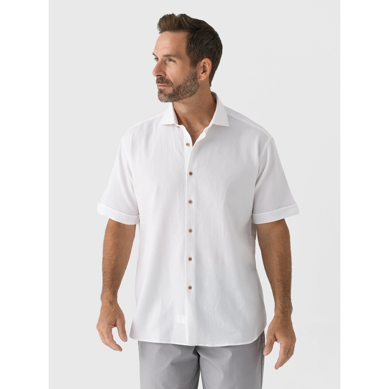 A comfortable short-sleeve button-down shirt made from lightly textured, breathable cotton-spandex fabric.
