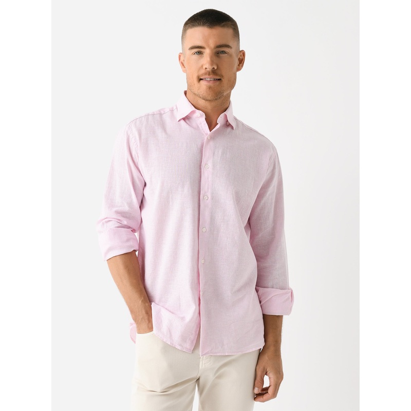 A woven button-down shirt made from a lightweight linen-cotton blend with a micro stripe print.