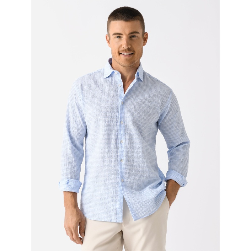An airy dress shirt made from breathable seersucker fabric with a subtle gingham print.