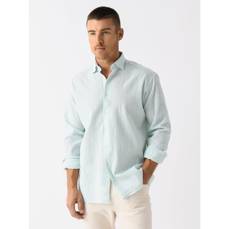 A lightweight button-down shirt made from airy seersucker fabric with a subtle stripe print.
