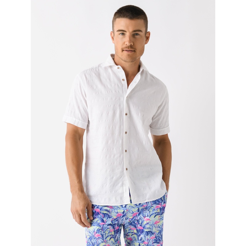 DESCRIPTION:A lightweight short-sleeve button-down shirt made from a cotton and linen blend with a subtle stitched design.FEATURES:Spread CollarButton-Down PlacketCurved HemStitched Pattern70% Cotton, 30% LinenClassic FitModel is wearing size Medium shirt.