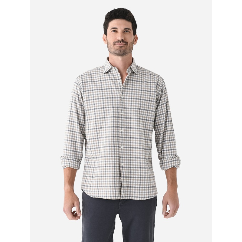 Casual button-down shirt with a neutral plaid print made from soft brushed cotton fabric.