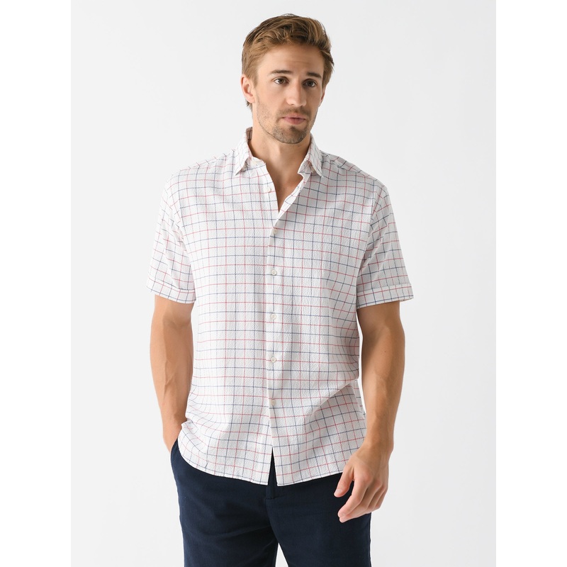 A lightweight button-down shirt made from breathable seersucker fabric with a two-tone windowpane print.