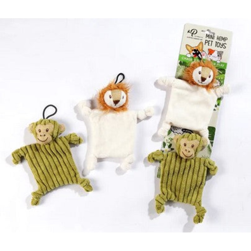 Petique's Mini Flying Hemp Monkey and Lionare non-toxic, cute and fun! Made of the softest fabric to optimize cuddle and play, even the most sensitive teeth would love this play time withthese adorable toys!For more exciting and interactive fun, there is a