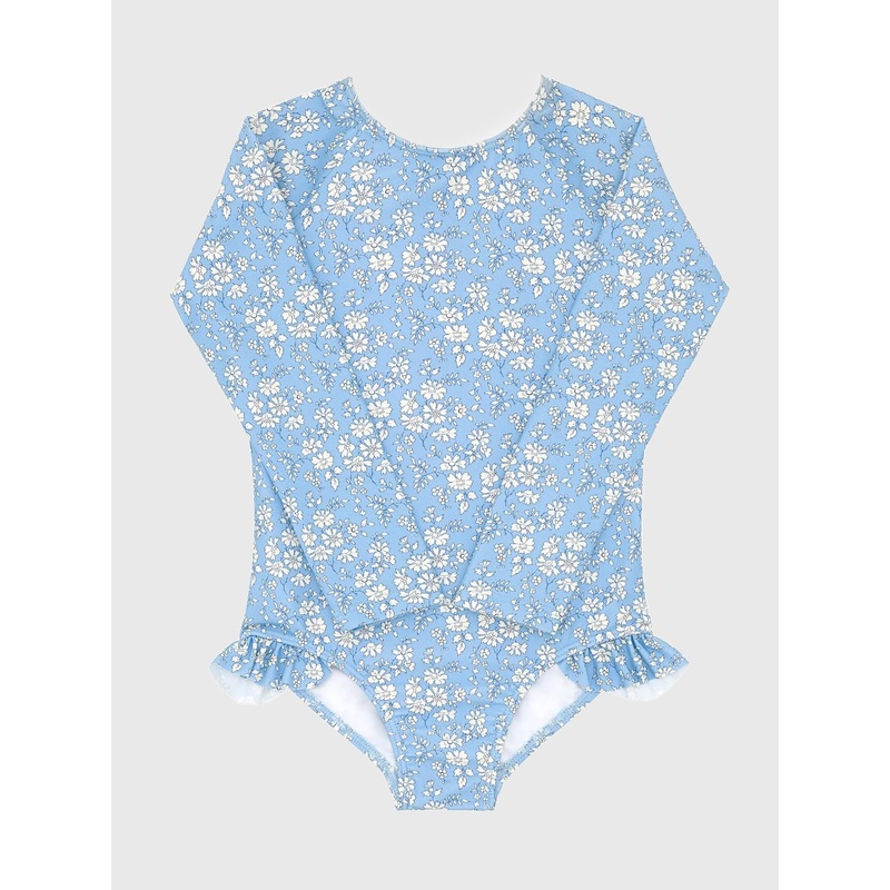 This rash guard style one-piece swimsuit is made with Liberty Fabrics and features a back grosgrain ribbon detail.