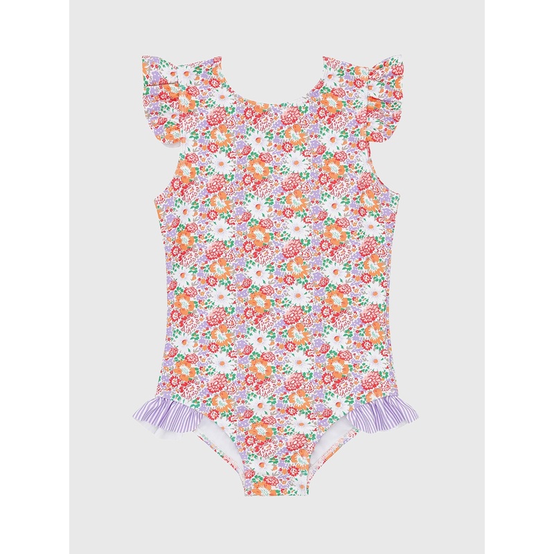 DESCRIPTION:A charming rash guard one-piece swimsuit with sweet ruffle cap sleeves and a colorful floral print. FEATURES:Round NecklineBack Ribbon & Button ClosureRuffle SleevesRuffle Leg TrimFull CoverageUPF 50+ Sun ProtectionAll-Over Novelty Print86% Pol