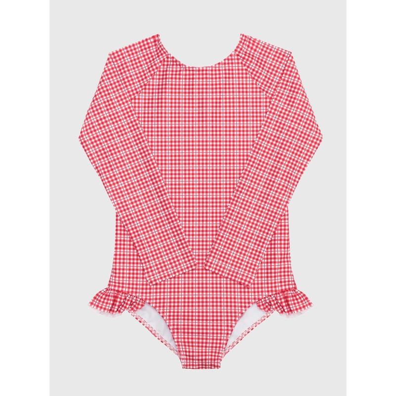 DESCRIPTION:A signature rash guard one-piece swimsuit, featuring a full-coverage design, a bright gingham print, and charming ruffle leg trims.FEATURES:Round NecklineBack Ribbon & Button ClosureRuffle Leg TrimFull CoverageAll-Over Gingham PrintUPF 50+ Sun