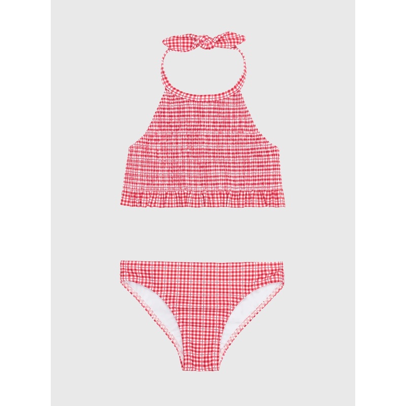 DESCRIPTION:A gingham-printed bikini set featuring an adjustable halter neckline and a comfortable smocked design.FEATURES:Halter NecklineSmocked BodiceRuffle HemMatching BottomModerate CoverageAll-Over Gingham PrintUPF 50+ Sun Protection86% Polyester, 14%