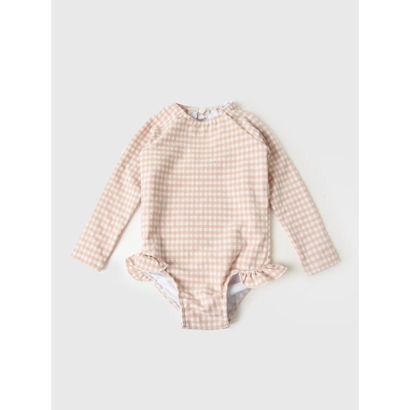 A rash guard style one-piece swimsuit with a grosgrain ribbon closure and ruffle-trimmed legs.