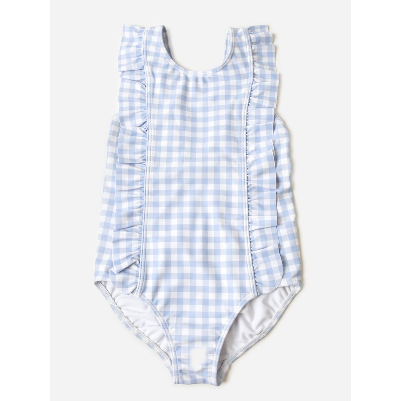 DESCRIPTION:A pinafore-style one-piece swimsuit in a beautiful light blue gingham print.FEATURES:Round NecklineWide StrapsRuffle TrimFull CoverageAll-Over Gingham PrinUPF 50+ Sun Protection86% Polyester, 14% LycraClassic Fit* Sizes 1, 2T & 3/4T Have a Full