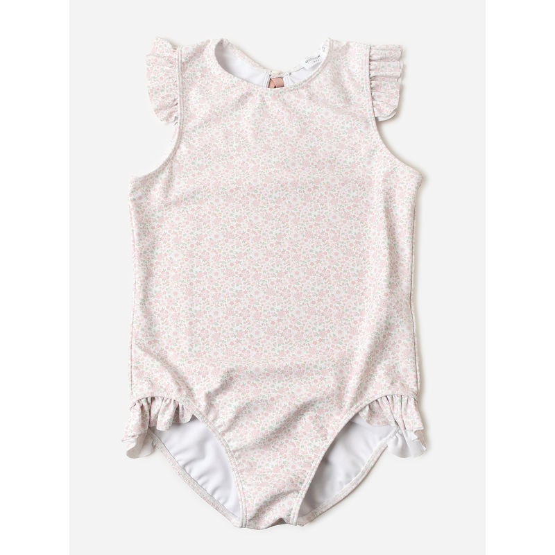 A ruffle-trimmed one-piece swimsuit with a dainty floral print and back grosgrain bow detail.