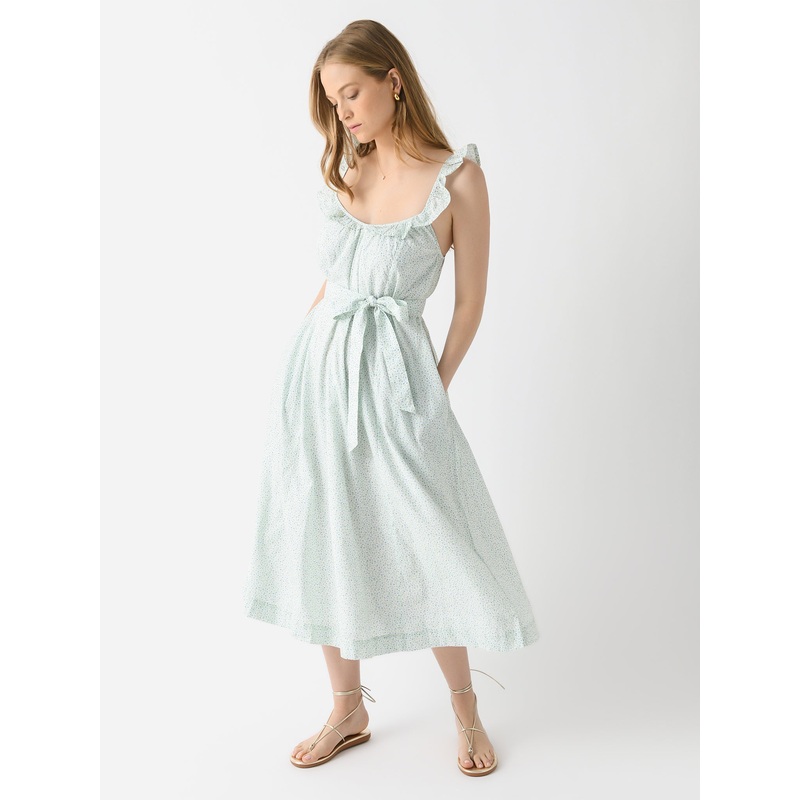 A lightweight cotton dress with a ditsy floral print, ruffle-trimmed straps, and an optional self-tie belt.