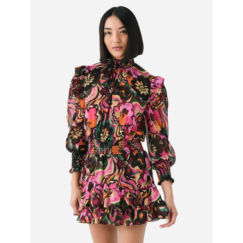 DESCRIPTION:An effortless mini dress featuring a high smocked neckline, an elastic waistline, and a tiered ruffle skirt in a groovy floral print.FEATURES:High Smocked NecklineBack Keyhole Button ClosureRuffle Shoulder3/4 Length SleevesSmocked CuffsSmocked