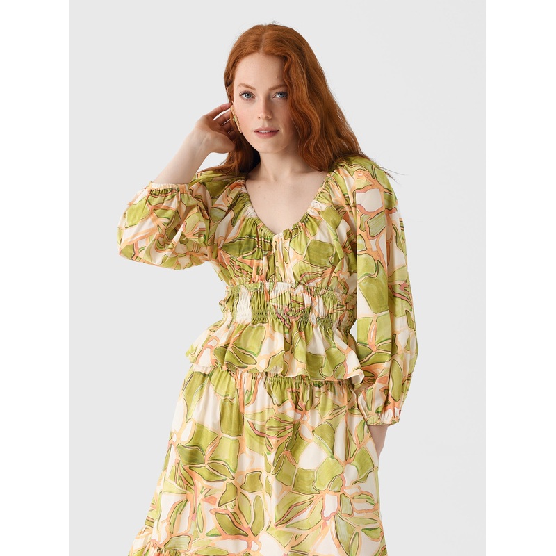 DESCRIPTION:This light and airy blouse is designed with long blouson sleeves and elasticized cuffs. It offers the option to be worn on or off the shoulders. The deep v-neckline and flattering ruching at the waist create a beautifully defined silhouette.FEA