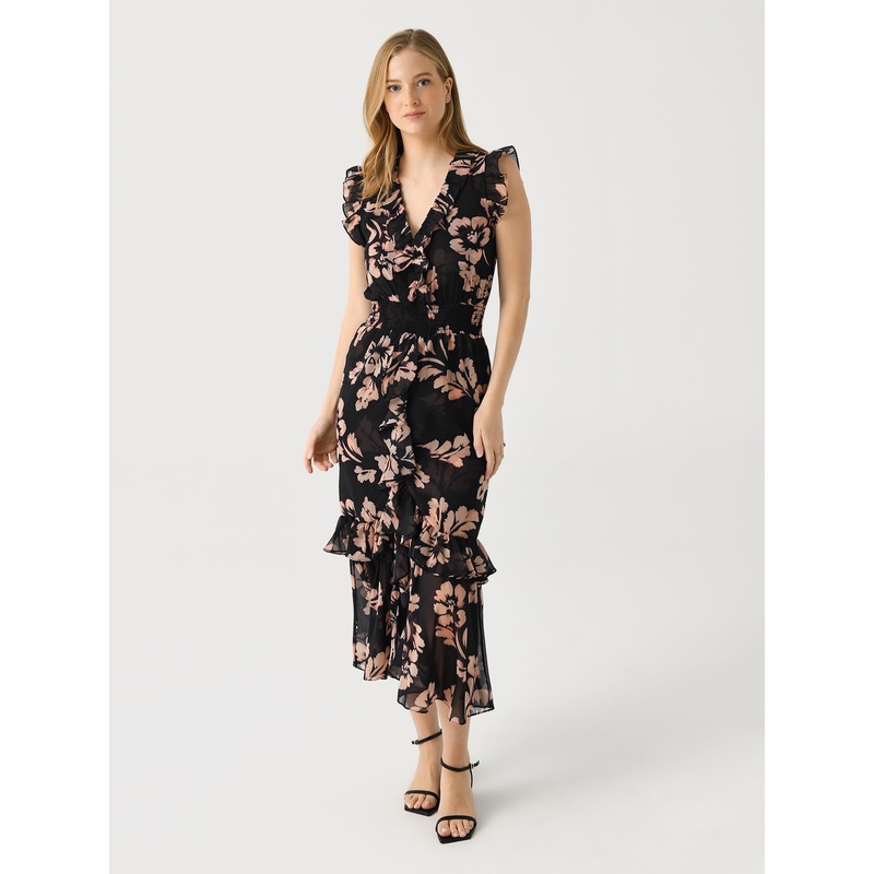 DESCRIPTION:The Kidada dress is a chic and elegant piece perfect for any occasion. Its luxurious chiffon fabric, floral print, and ruffle details create a stunning and feminine look.FEATURES:V-NecklineRuffle TrimsSmocked WaistTiered SkirtCascading RufflesM