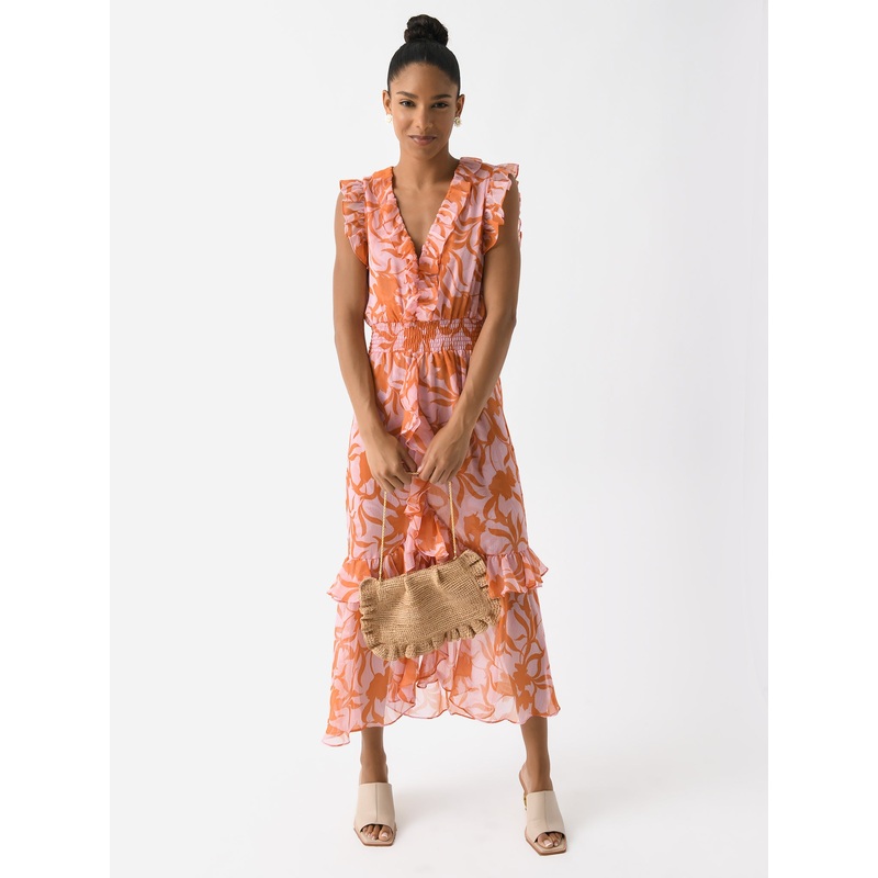 DESCRIPTION:A ruffle-trimmed dress made from polyester chiffon with a long, tiered skirt with cascading ruffles.FEATURES:V-NecklineRuffle TrimsSmocked WaistTiered SkirtCascading RufflesMidi SilhouetteAll-Over Novelty Print100% Polyester ChiffonClassic FitM