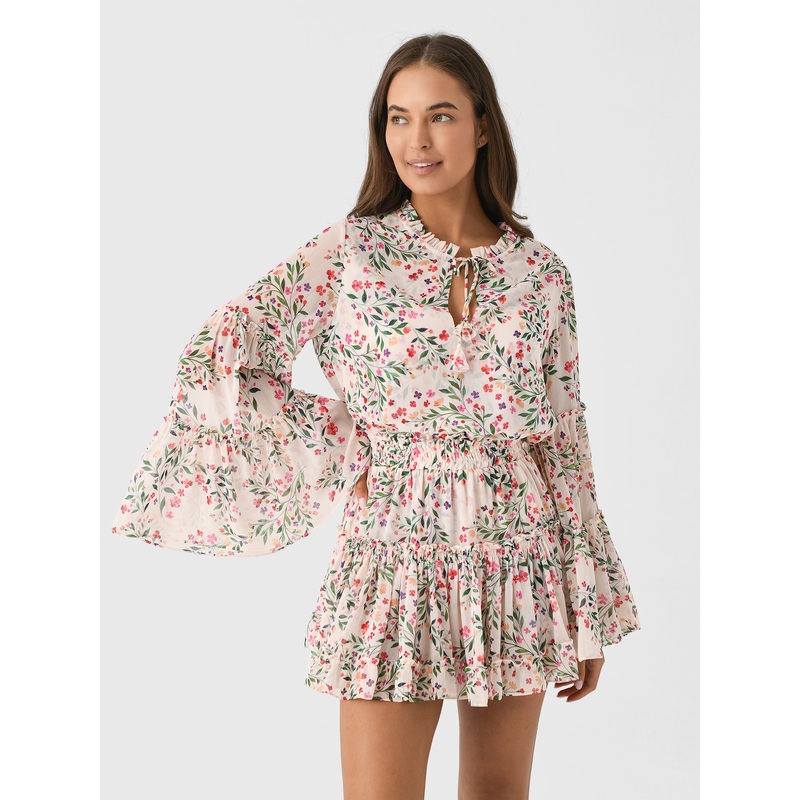 DESCRIPTION:This effortless mini dress features a split neckline with signature petal tassel ties for a touch of bohemian charm. The tiered bell sleeves and ruffle-trimmed skirt create a playful silhouette.FEATURES:Ruffle CollarSelf-Tie NecklineBell Sleeve