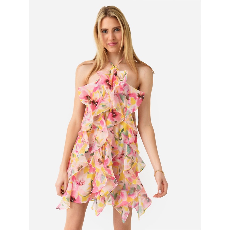 DESCRIPTION:Chiffon ruffled mini dress with a novelty print.FEATURES:Mini DressThin StrapsSleevelessRuffle BodyAll-Over Novelty PrintChiffon Fabrication100% PolyesterClassic FitModel is wearing size Small dress.Model's Measurements: Height: 5'10.5" | Bust: