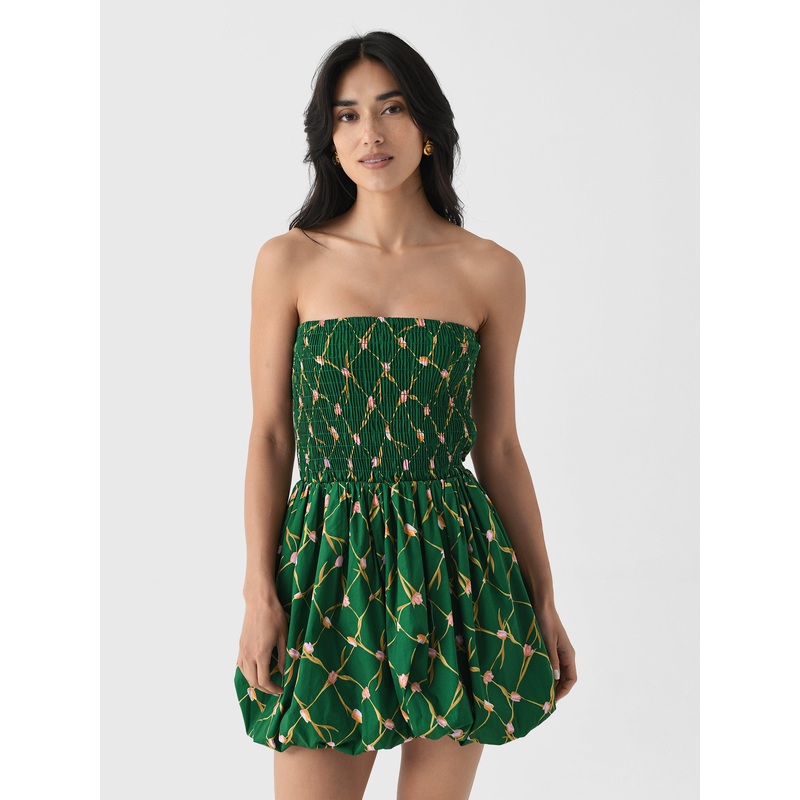 DESCRIPTION:This chic mini dress features a comfortable smocked bodice, a playful bubble hem, and a vibrant tulip print.FEATURES:Strapless NecklineSmocked BodiceBubble SkirtMini SilhouetteAll-Over Novelty Print97% Cotton, 3% SpandexClassic FitModel is wear