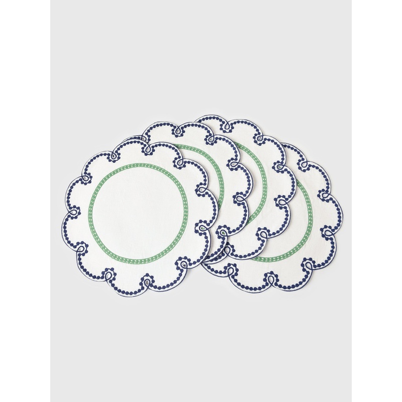 DESCRIPTION:A set of four round linen placemats with scalloped edges and an elegant embroidered design.