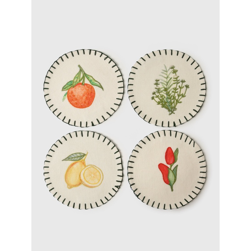DESCRIPTION:These charming linen coasters feature adorable fruit and vegetable motifs, perfect for adding a touch of rustic charm to your table. Made from durable linen, they're both stylish and functional.FEATURES:Set of 4 CoastersEmbroidered Design100% L