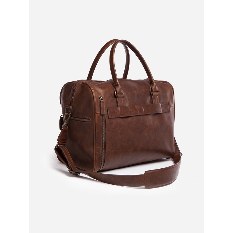 Functional leather duffel bag with multiple pockets and an adjustable strap.