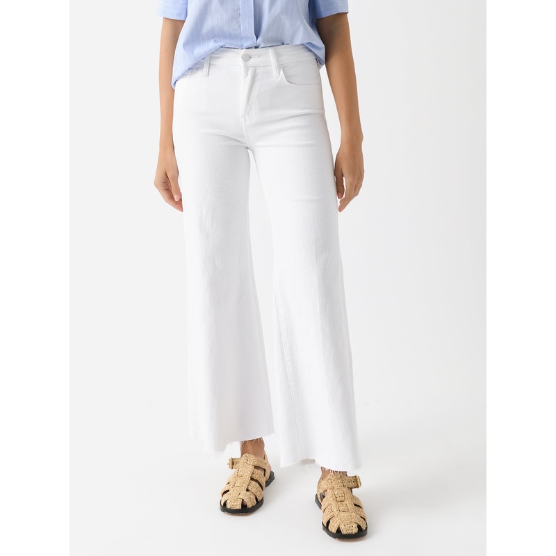 A wide-leg jean made from stretch denim with a full inseam and raw edge hem designed for petite bodies.