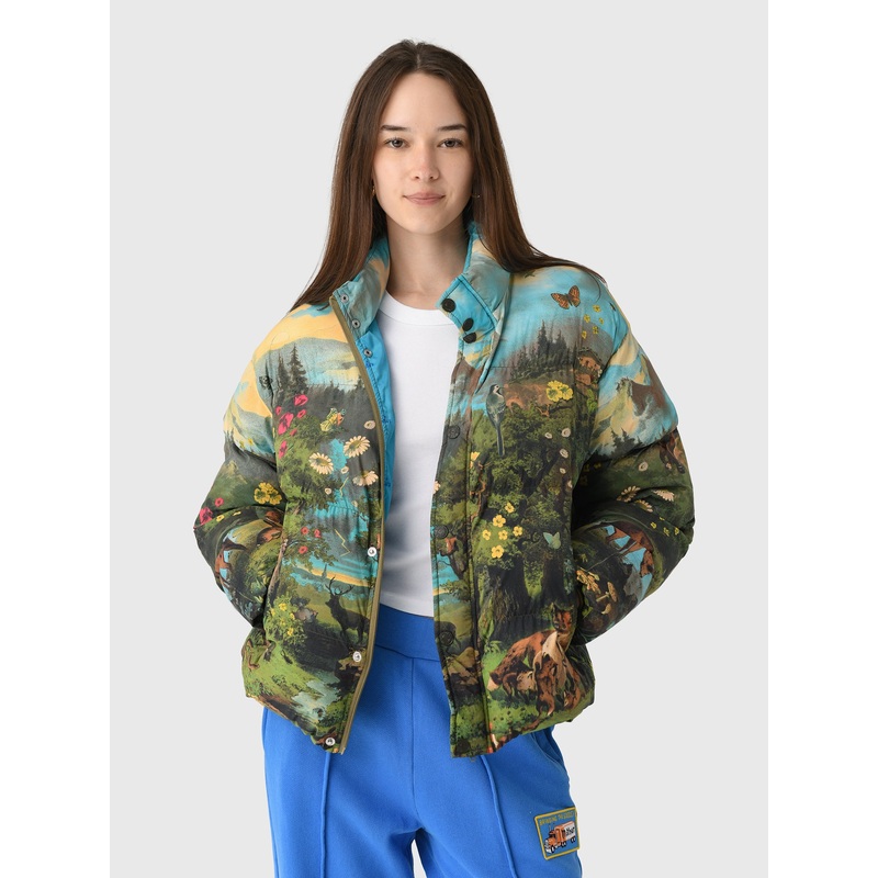 This classic puffer features a vibrant, colorful pastoral graphic on quilted fabric. With a slightly cropped, boxy fit, it includes a high collar, zip and snap closure, and convenient slit pockets.