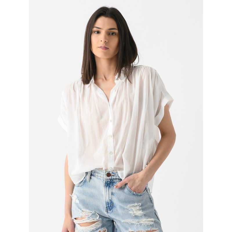 DESCRIPTION:A semi-sheer cotton top with gathered seams and a tropical embroidered design along the shoulders.FEATURES:Spread CollarGathered SeamsEmbroidered DesignCurved Hem100% CottonClassic FitModel is wearing size Small top.Model's Measurements: Height