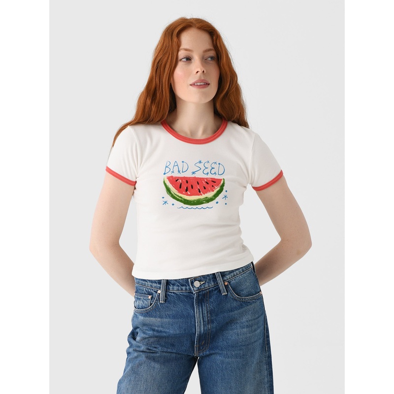 DESCRIPTION:A slightly cropped tee made from soft cotton with a custom graphic.FEATURES:Crew NecklineShort SleevesFront GraphicCropped Silhouette100% CottonSlim FitModel is wearing size Small tee.White: Model's Measurements: Height: 5'8.5" | Bust: 32B | Wa