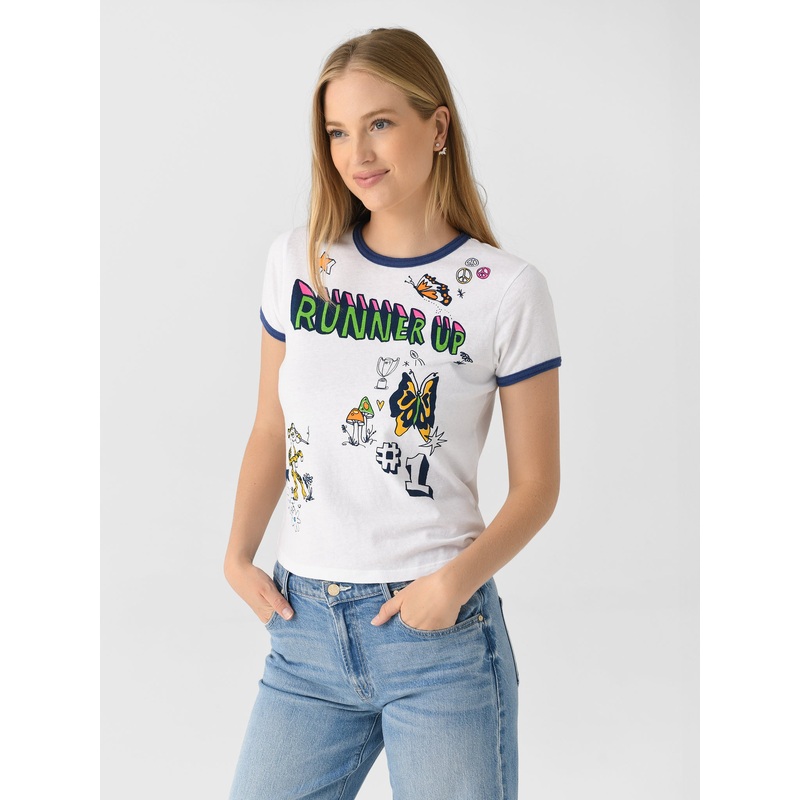 This crewneck tee, made from a recycled cotton blend, features extra-short sleeves, a slightly shrunken fit, and a colorful doodle print.
