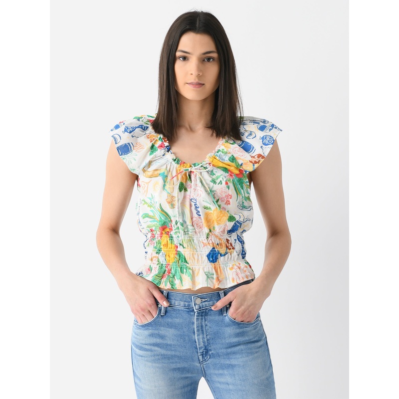 DESCRIPTION:A semi-sheer blouse made from lightweight cotton with a gathered neckline and smocked panel that creates a peplum hem.FEATURES:Self-Tie NecklineRuffle SleevesSmocked WaistPeplum HemAll-Over Novelty Print100% CottonClassic FitModel is wearing si