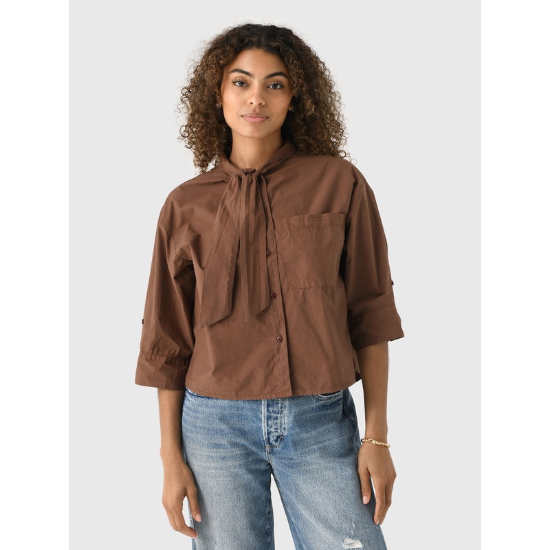 DESCRIPTION:This lightweight cotton button-down shirt features a feminine lavaliere collar and 3/4 length sleeves for an effortlessly polished look. Designed with a relaxed silhouette, its a versatile piece that blends softness, ease, and timeless charm.FE