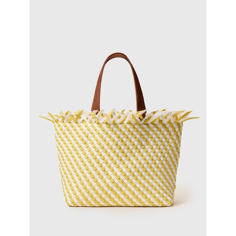 A medium-sized tote bag made from handwoven neoprene material with a matching zipper pouch and durable nylon handles.