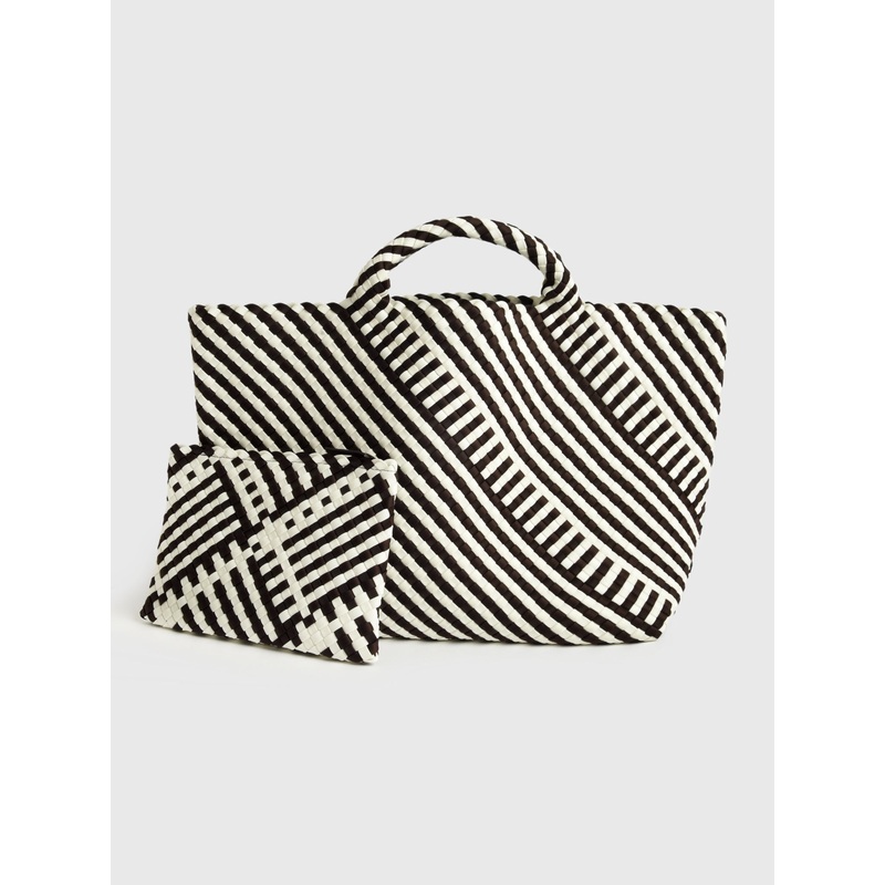 DESCRIPTION:This large tote bag is made from signature neoprene fabric and features a two-tone stripe design.FEATURES:Open TopMatching Pouch IncludedUnlinedHandwoven ConstructionNeoprene FabricationDimensions: 22 in. L x 12 in. H x 8 in. D | Handle Drop: 7