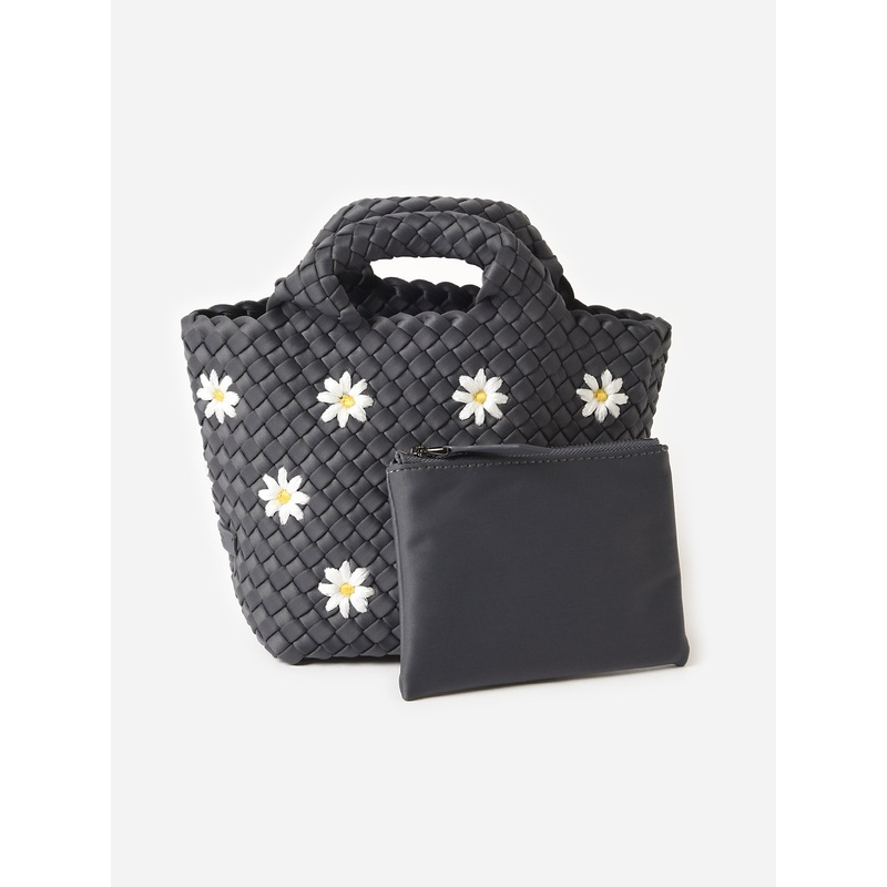 DESCRIPTION:A super mini tote featuring a whimsical embroidered daisy design with an optional strap and matching pouch.FEATURES:Open TopRemovable StrapEmbroidered DaisysMatching Pouch IncludedUnlinedHandwoven ConstructionNeoprene FabricationDimensions: 6 i