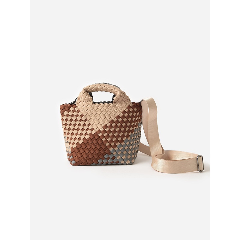 DESCRIPTION:A handwoven neoprene tote bag with a multi-colored geometric design.FEATURES:Open TopRemovable StrapMatching Pouch IncludedUnlinedHandwoven ConstructionNeoprene FabricationDimensions: 6 in. H x 9 in. W x 5 in. D | Handle Drop: 3 in.