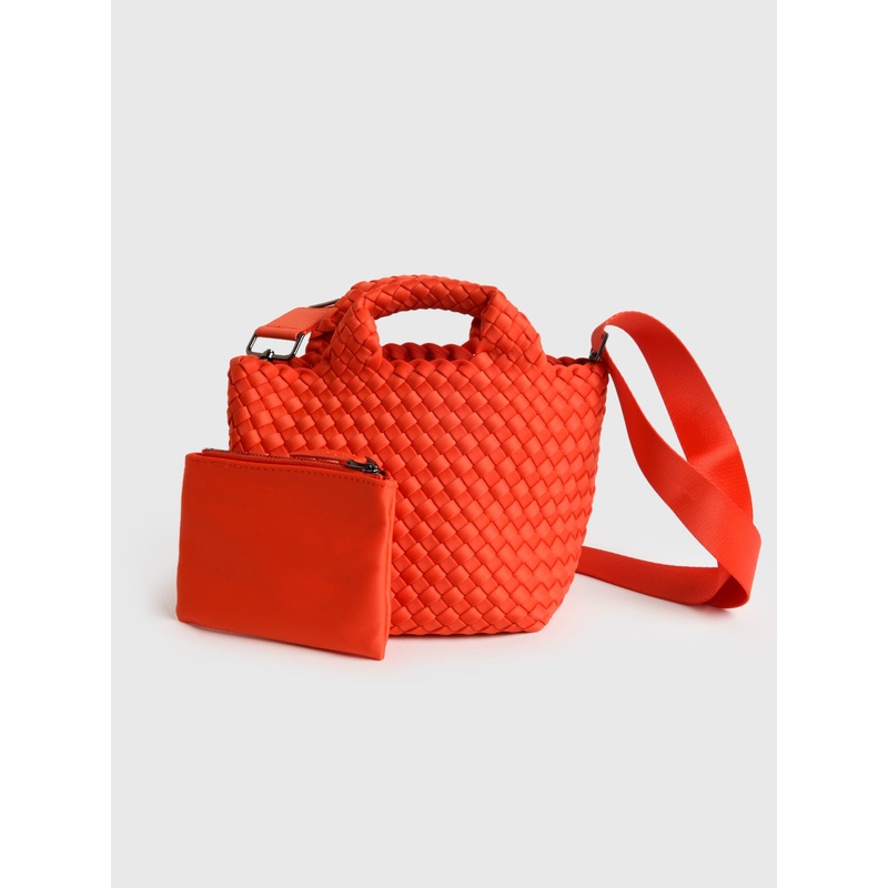 DESCRIPTION:This mini tote bag is made from handwoven neoprene and features a versatile design that can be used day or night.FEATURES:Open TopRemovable StrapMatching Pouch IncludedUnlinedHandwoven ConstructionNeoprene FabricationDimensions: 6 in. H x 9 in.