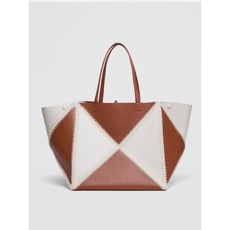 DESCRIPTION:The Origami Tote is a functional and stylish solution for carrying all your essentials. Crafted from soft patent alt-nappa, it features contrast merrow stitching that creates a patchwork effect. This tote also folds completely flat, making it e