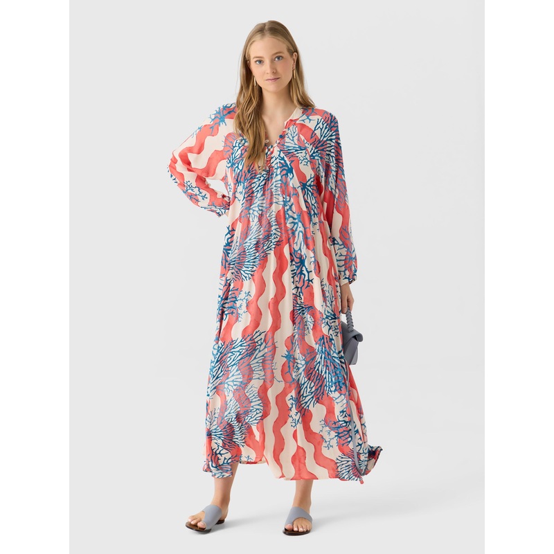 Step into timeless elegance with this gracefully designed maxi dress. It features a flattering A-line silhouette, a refined covered button placket, and beautifully voluminous sleeves, creating a sophisticated and chic look.