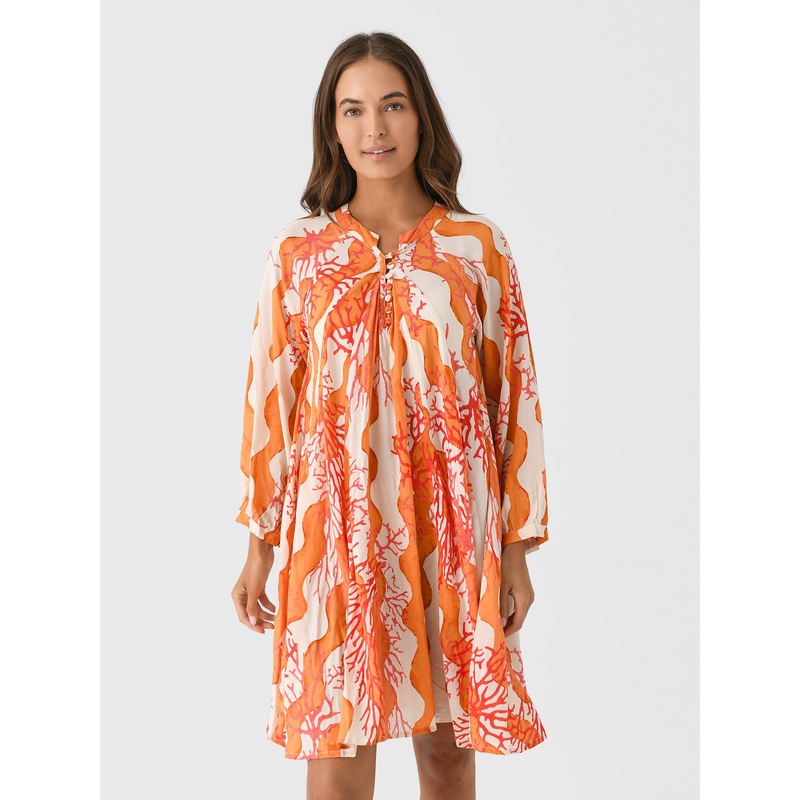 DESCRIPTION:This relaxed mini dress is made from soft rayon with a flattering A-line cut and voluminous sleeves.FEATURES:Round NecklinePartial Button PlacketPuff SleevesMini SilhouetteAll-Over Novelty Print100% RayonRelaxed FitModel is wearing size Small d