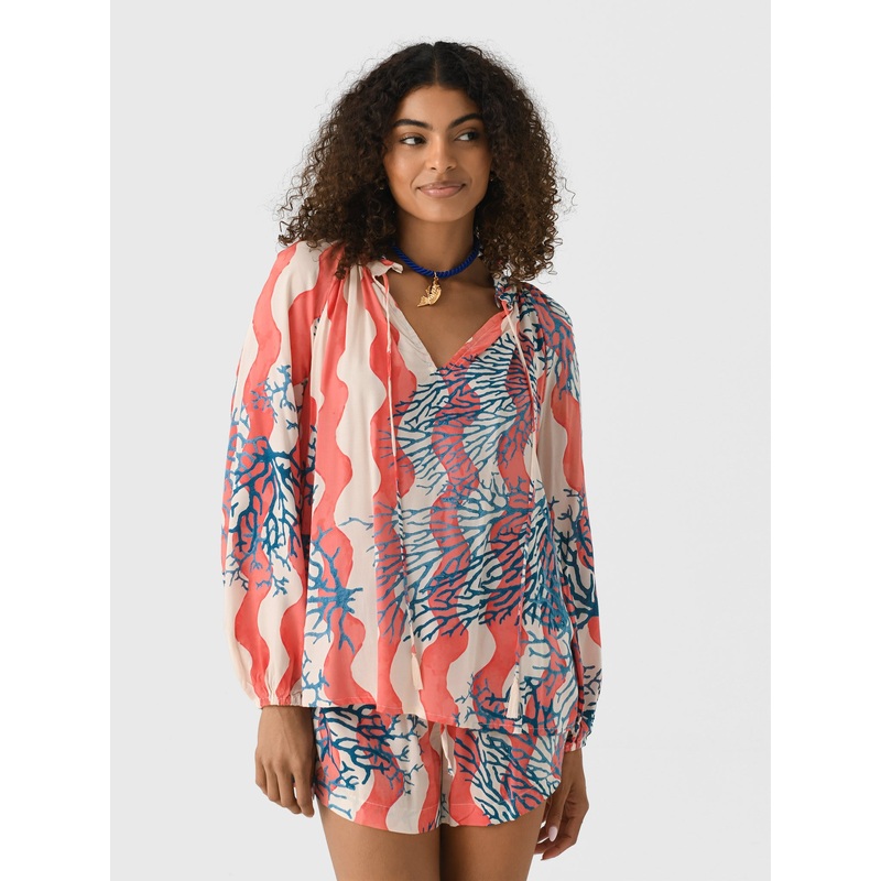 A flowy blouse made from wavy-coral printed rayon with a self-tie neckline and voluminous sleeves.