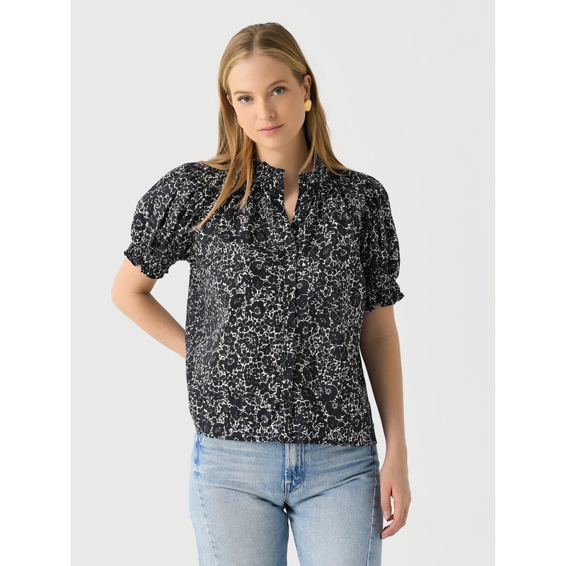 DESCRIPTION:Lightweight top with ruffle-trimmed elastic neckline and cuffs.FEATURES:Elastic NecklinePuff SleevesButton-Down PlacketRuffle Trims100% PolyesterClassic FitModel is wearing size Small top.Small Floral: Model's Measurements: Height: 5'9.5" | Bus