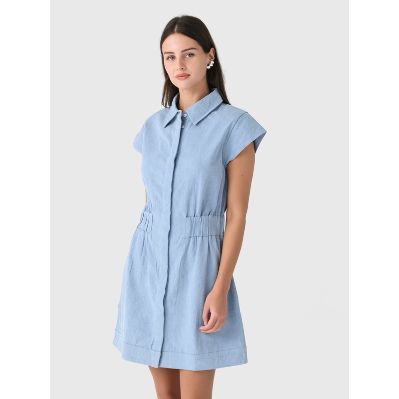 DESCRIPTION:An effortlessly elegant shirtdress made from lightweight fabric and finished with feminine cap sleeves, a banded waist, and a hidden button-down front closure.FEATURES:Spread CollarCap SleevesBanded WaistHidden Button ClosureSide PocketsLightwe
