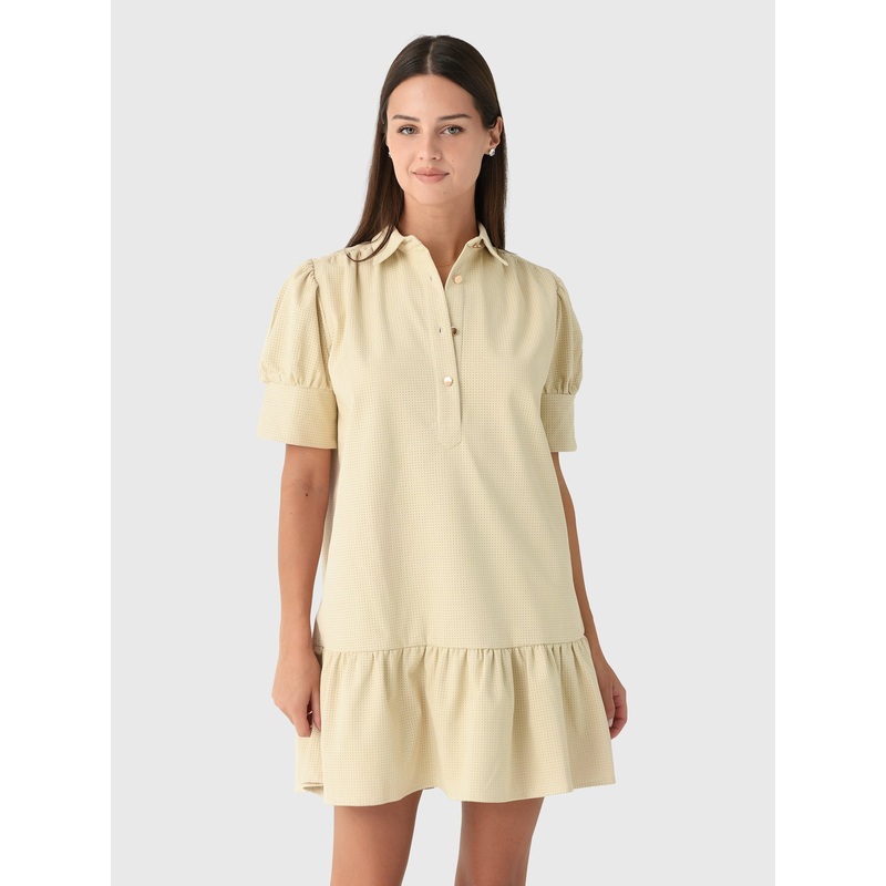 DESCRIPTION:Crafted from faux leather, this popover dress is a fresh take on a classic silhouette. It features a polo-style collared neckline with a partial button placket and charming puff sleeves. A ruffled, drop-waist skirt adds a fun, feminine touch to