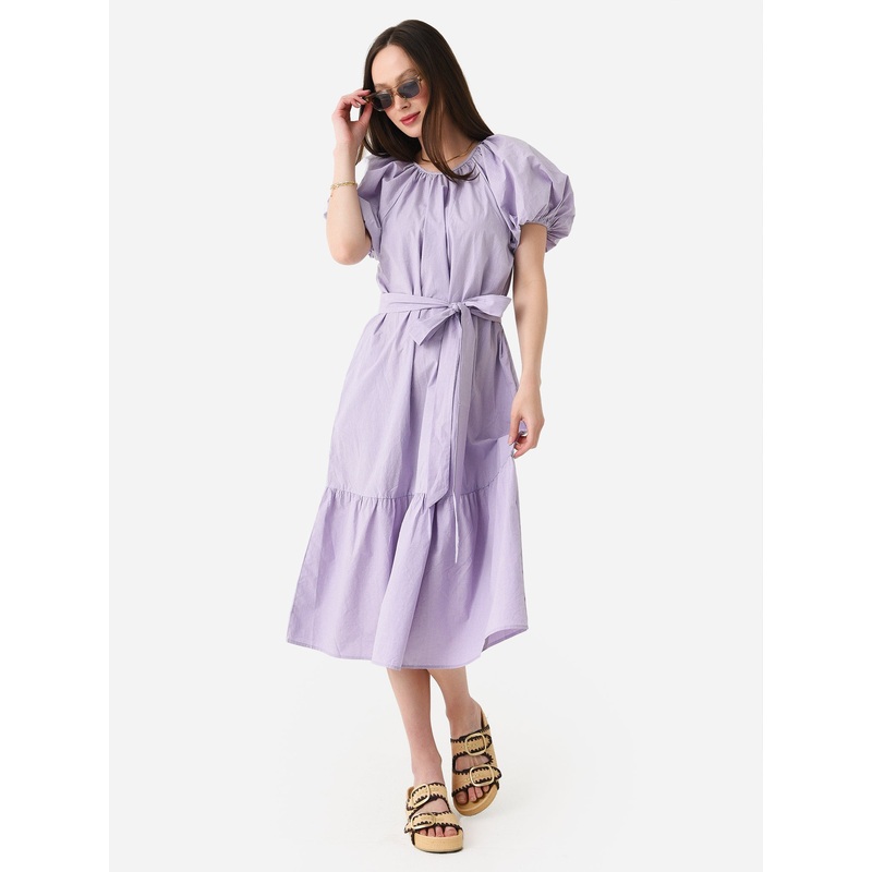DESCRIPTION:Poplin dress with a gathered neckline, puff sleeves, and a self-tie belt.FEATURES:Midi DressRound Gathered NecklineShort Puff SleeveSelf-Tie BeltTiered SkirtStraight HemPoplin Fabrication100% CottonRelaxed FitModel is wearing size Small dress.M
