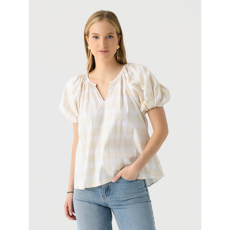 DESCRIPTION:A lightweight and airy top with puff sleeves and an oversized silhouette.FEATURES:V-NecklinePuff SleevesAll-Over Novelty PrintCotton BlendRelaxed FitModel is wearing size Small top.Large Check: Model's Measurements: Height: 5'9.5" | Bust: 32C |