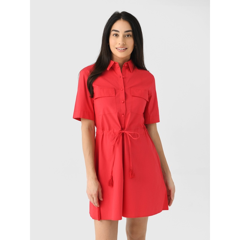 A casual shirt-style dress made from a comfortable cotton blend with flap chest pockets and an adjustable drawstring waist.