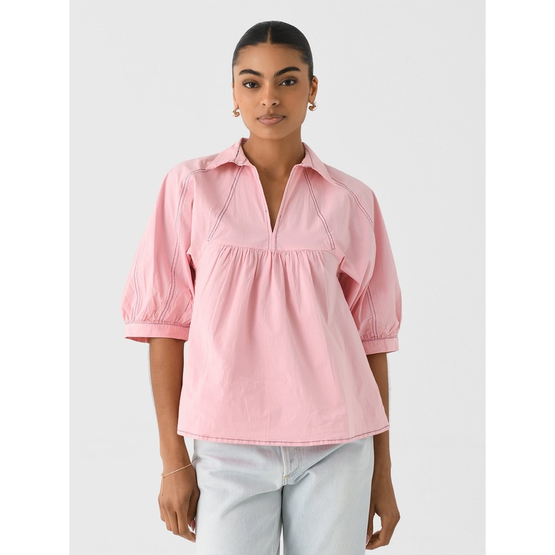 A lightweight blouse with half-length puff sleeves, a slightly gathered design, and contrast stitching.