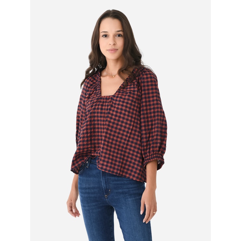DESCRIPTION:Gingham-printed top with a v-neckline and short puff sleeves.FEATURES:V-NecklinePuff SleevesElastic CuffsSlight Boxy SilhouetteAll-Over Gingham Print100% CottonClassic FitModel is wearing size Small top.Rust Check: Model's Measurements: Height: